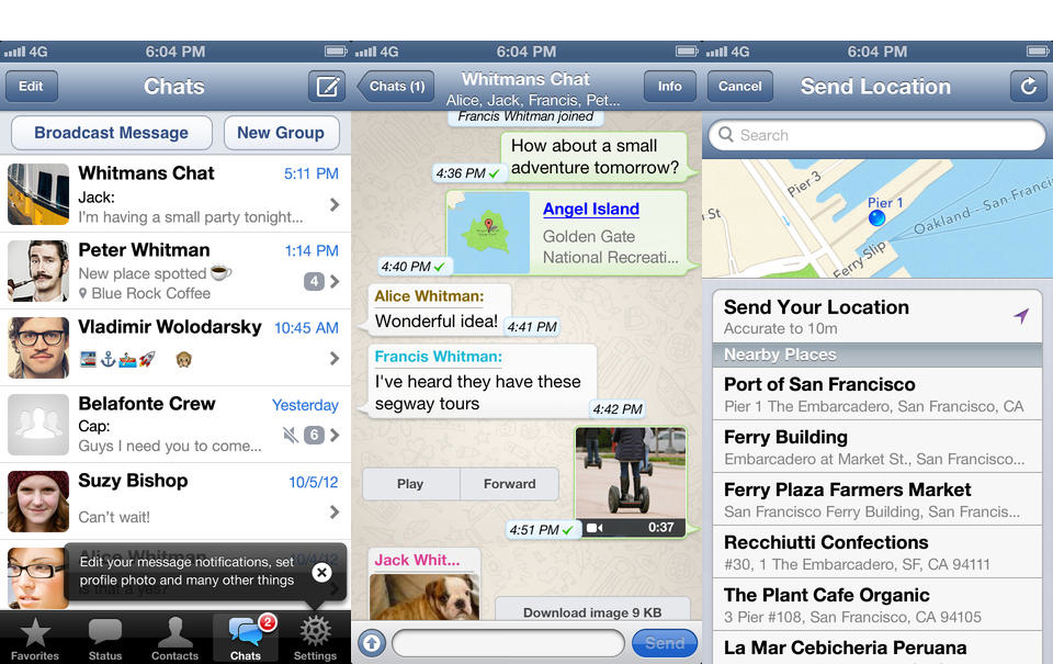WhatsApp с начала года удерживал первую строчку в чарте платных iPhone-приложений для российских пользователей. С недавних пор программа стала бесплатной и для iOS, и для Android. В WhatsApp можно отправлять фото, видео, голосовые заметки и контакты, он тоже интегрируется в адресную книгу, и можно переслать по почте историю из какого-либо чата.