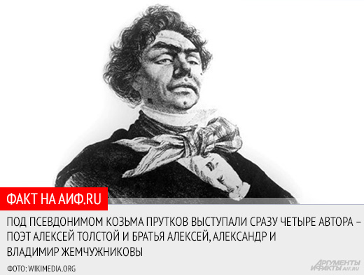 Философ и сибарит Козьма Прутков смешил читателей едкими и меткими фразами в адрес чиновников и бездарных писателей на страницах журналов «Современник» и «Искра» в середине 1800-х годов. Читатели знали, что автор — отставной военный, родом из окрестностей Сольвычегодска. А на самом деле под фамилией Пруткова скрывались известный писатель, поэт и драматург Алексей Толстой и три брата-литератора Алексей, Александр и Владимир Жемчужниковы, которые успешно публиковались и под своими настоящими именами.