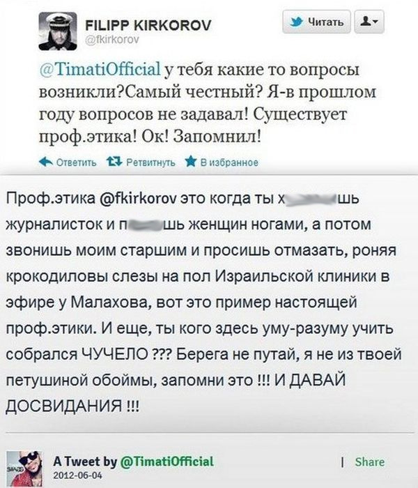 Рэпер решил не спускать певцу с рук его выпад. В ответ Тимати написал, что о профессиональной этике Киркорову стоило вспомнить, когда он оскорблял журналистку (очевидно, речь шла об известной истории с розовой кофточкой корреспондента Ирины Ароян) или бил ногами женщину (случай, когда Киркоров напал на второго режиссера церемонии «Золотой граммофон-2011» и стал бить ее ногами за то, что ему в глаза направили свет софитов). Кроме того, Тимати косвенно подтвердил, что болезнь Киркорова была лишь «закосом» от ответственности, так как после содеянного певец просил его «отмазать». «Потом звонишь моим старшим и просишь отмазать, роняя крокодиловы слезы на пол Израильской клиники в эфире у Малахова, вот это пример настоящей профессиональной этики. И еще, ты кого здесь уму-разуму учить собрался, чучело? Берега не путай, я не из твоей петушиной обоймы, запомни это! И давай до свидания!» – написал возмущенный Тимати.