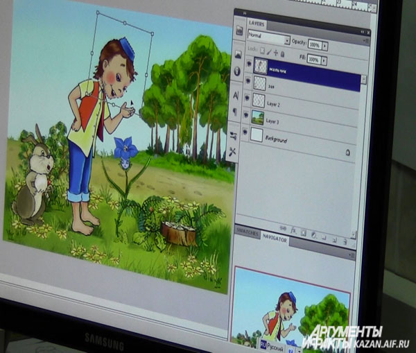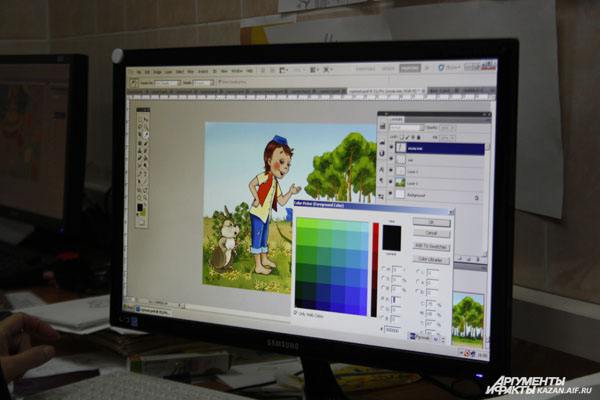 «Вот, например, я создаю мальчика, — рассказывает Неля Абдеева. — Выбираю по сценарию, какие позы, какая у него здесь мимика. Рисую его на планшете в Adobe Photoshop», выбрав функцию «карандаш». Затем раскрашиваю«.