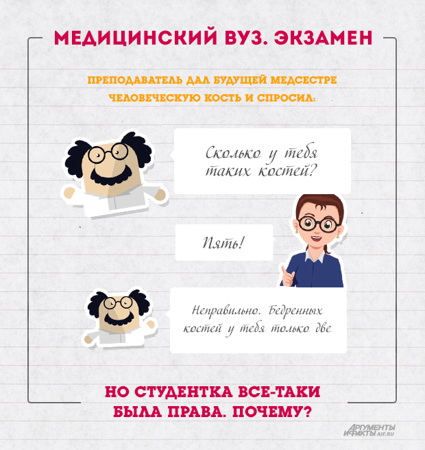 Ответ: студентка была беременна. Она имела в виду две свои бедренные кости, две кости ребенка и ту кость, которую она держала в руках на экзамене.