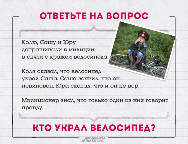 Ответ: Если велосипед украл Коля, то Саша и Юра говорят правду. Если украл Саша, то и Коля и Юра говорят правду. Если украл Юра, то правду говорит только Саша. Значит вор — Юра.
