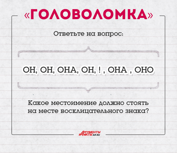 Ответ: В строчке всего семь местоимений. Каждое из них обозначает день недели. Восклицательный знак стоит на месте пятницы, а слово пятница женского рода, значит правильный ответ – ОНА.