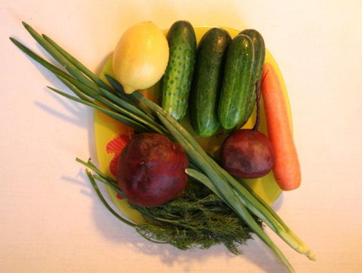 Нам понадобится: Свекла 300 гр (10 руб), морковь 200 гр !5 руб), свежие огурцы 500 гр (20 руб), яйцо 1шт (3 руб), сметана 1 банка (20 руб), лимон 1 шт (10 руб), лук зеленый 50 гр (20 руб), укроп 50 гр (20 руб), картофель-500 гр (15 руб), лук репчатый-150 гр (5 руб), кабачок- 250 гр (10 руб), сыр-200 гр (55 руб), шампиньоны-20 гр (25 руб), чеснок несколько зубчиков (2 руб), майонез- 100 гр (10 руб), мята (20 руб).