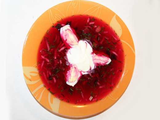 Приготовление: Сначала делаем холодный борщ. Овощи моем, чистим. Сырую свеклу и морковь натираем на мелкой терке, огурцы - на крупной. В принципе, огурцы можно порезать соломкой, но на терке быстрее. Нарезаем лук и укроп (зелени не жалеем), лука желательно положить побольше. Выдавливаем половинку лимона и все это заливаем кипяченой водой. Добавляем соль и сахар, но кладем немного меньше, чем нужно, чтобы потом отрегулировать вкус, когда борщ немного настоится.