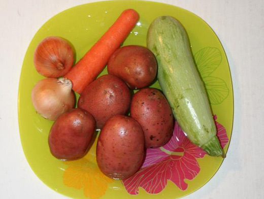 Пока холодный борщ настаивается, беремся за запеченные овощи. Все тоже моем, чистим картофель, кабачок, морковь, репчатый лук и нарезаем кругляшками. Выкладываем на сковороду или противень и отправляем в духовку – 200С.