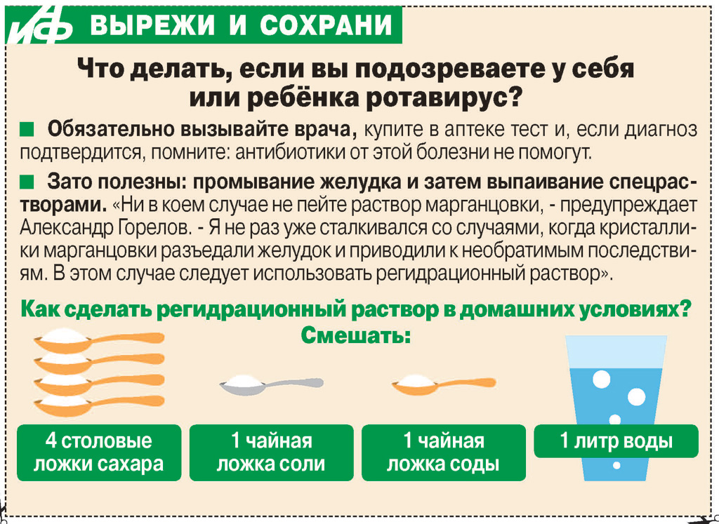- Зато полезны: промывание желудка и затем выпаивание спецрастворами. «Ни в коем случае не пейте раствор марганцовки, - предупреждает Александр Горелов. - Я не раз уже сталкивался со случаями, когда кристаллики марганцовки разъедали желудок и приводили к необратимым последствиям. В этом случае следует использовать регидрационный раствор».