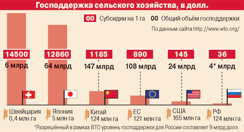 * Разрешённый в рамках ВТО уровень господдержки для России составляет 9 млрд долл.