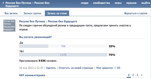 Основание для этих заявлений ему дало голосование, проведенное в сообществе: «Хотите ли вы революций?» И 75% участников проголосовали: не хотят.