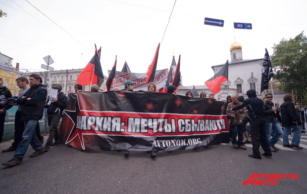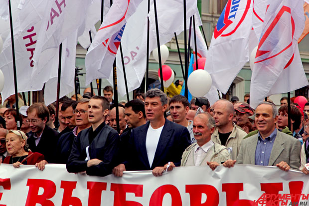 Марширующие разделились на две колонны: красную левую, во главе которой шел Сергей Удальцов, и белофлаговую правую, под руководством Гарри Каспарова и Бориса Немцова. Центр заняли журналисты и телеоператоры. Впереди правой колонны, в роли уличного глашатая, скандируя в мегафон привычные для московских митингов лозунги, шел Илья Яшин. «Путин, лыжи, Магадан», - кричал молодой политик.