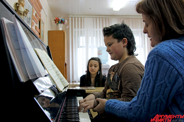 На отчётном концерте в кодинской музыкальной школе воспитанники Борисовой играют произведения Глена Миллера. Сама преподавательница сидит в концертном красном пиджаке в первом ряду и внимательно следит за учениками.