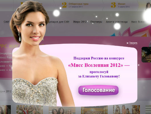 Как сообщалось, Елизавета Голованова из Смоленска стала победительницей конкурса «Мисс Россия-2012» в марте. Она получила корону, 100 тысяч долларов, образовательный грант и право представлять Россию на предстоящем конкурсе «Мисс мира».