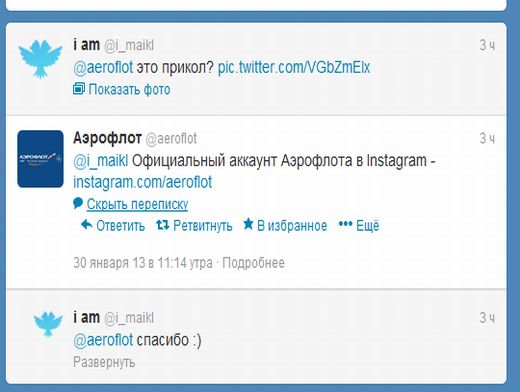 Между тем, на официальной странице сервиса микробоголов Твиттер, принадлежащей авиакомпании «Аэрофлот», сообщается, что официальный аккаунт авиакомпании в Instagram называется aeroflot, а вовсе не aeroflotairlines.