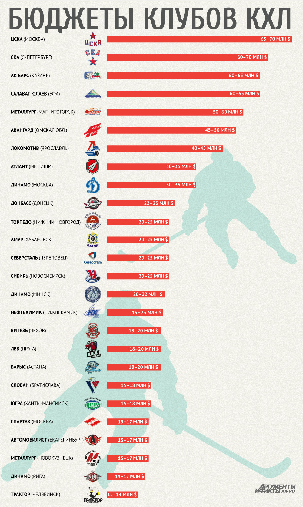 Самыми «бедными» же командами по оценке АиФ.ru являются «Металлург» из Новокузнецка (15-17 миллионов долларов), рижское «Динамо» (14-17 миллионов долларов) и челябинский «Трактор» (12-14 миллионов долларов). Вплотную к этой тройке расположился московский «Спартак» с размером бюджета на уровне приблизительно 15-17 миллионов долларов.