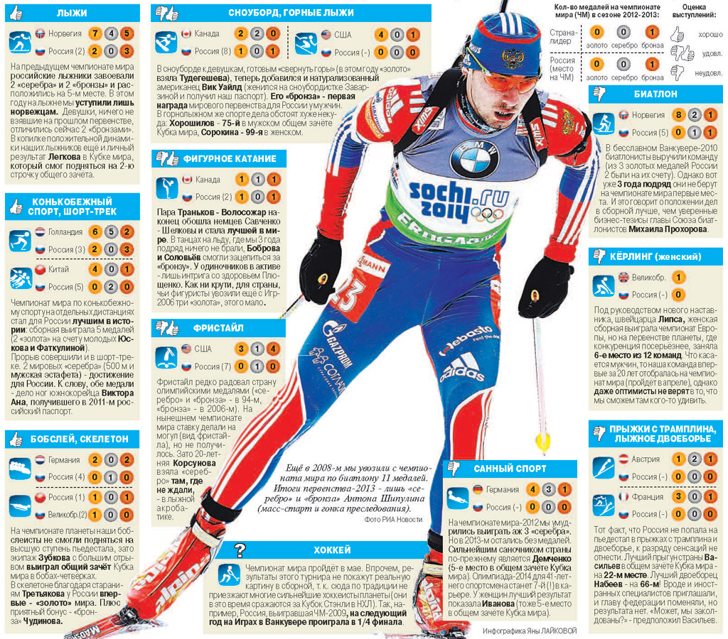 На чемпионате мира-2012 мы умудрились выиграть аж 3 «серебра». Но в 2013-м остались без медалей. Сильнейшим саночником страны по-прежнему является Демченко (5-е место в общем зачёте Кубка мира). Олимпиада-2014 для 41-летнего спортсмена станет 7-й (!) в карьере. У женщин лучший результат показала Иванова (тоже 5-е место в общем зачёте Кубка мира).