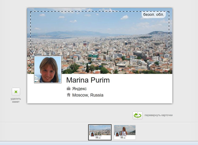 На оборотной стороне автоматически появится цитата из вашего профиля. Имя, место работы, цитату — все можно отредактировать прямо в макете. Может быть, цитата, актуальная для Facebook, не очень хорошо характеризует вас в жизни реальной, или вы не хотите никому при встрече сообщать, где вы работаете.