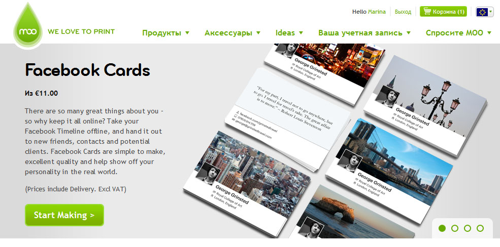 В контактах появятся ваш телефон, e-mail и адрес вашей странички в Facebook, конечно же. Сайт частично переведен на русский язык, так что трудностей с работой над визитками не будет. Когда вы проверите, что получилось, можно переходить к оформлению. Система сама определит ваше местонахождение и покажет стоимость доставки. Доставка в Россию 50 карточек мне обойдется в €3, если отправлять обычной почтой, или в €41, если DHL. Сами визитки сейчас ничего не стоят.
