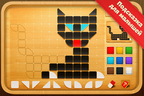 На экраны телефонов и планшетов перекочевали, пожалуй, все популярные у детей игры, например, кубики, интерактивная азбука, раскраски и т.д. Появилась в AppStore и настоящая мозаика! Это действительно новое слово в играх для мобильных устройств, по смыслу сильно отличается от привычных паззлов, которые предлагают самым маленьким, или виртуальных конструкторов. Причем играть в Детскую мозаику HD смогут даже двухлетки. Они, конечно, не оценят все возможности игры, но им доступно главное – чистое поле, на котором можно расставлять элементы. Но обо всем по порядку. В игре два варианта действий – «Собери картинку» и «Придумай сам». В первом нужно сложить рисунок по образцу. Доступно два экрана с образцами и обещают еще. Тут и просто абстрактные рисунки, и цветы, и буквы, и цифры, и домики. Сложность рисунков тоже разная, начинающим игрокам предлагается сложить простую картинку, заполнив только углы экрана, например. Второй режим – «Придумай сам». Здесь может порезвиться и уставший от конкретных заданий опытный игрок, и малыш. Составляется картина одним способом – перед вами чистый экран, справа – инструменты: квадратики и треугольники разных форм, которые можно сложить в круг, ромб или какую-нибудь неведомую фигуру. Малыши, конечно, предпочитают квадраты, которыми можно методично, с упорством двухлеток, замостить всю поверхность. Можно выбирать цвета будущей композиции, доступно 12, причем они довольно мягкие, не резкие. Удобно, что, зацепив один элемент, ты можешь ставить его много раз, не возвращаясь в палитру инструментов. Каждый фрагмент можно стереть, а в конце не забудьте сохранить картину в память устройства. Потом отправите шедевр бабушке. Есть одна тонкость – приложение платное, без пробных версий, и цена его довольно высока – $2,99. |