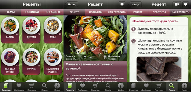 Для каждого рецепта указано время приготовления, количество порций, список покупок (можно составить свой, просто отметив нужное, чтобы потом купить все в магазине) и, конечно, как готовить. Рекомендации пошаговые, с фотографиями. Можно отмечать понравившиеся рецепты, чтобы потом они лежали в специальном разделе.