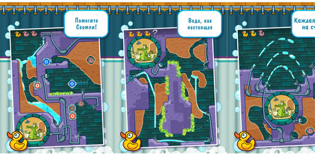 Забавный крокодил живет почему-то не в Африке, а в самом настоящем городе, под землей. К тому же он любит принимать ванну, но другие крокодилы решили помешать ему и сломали душ. Вам нужно будет убрать песок (просто проведя по нему пальцем), но делать это нужно не бездумно, а предугадывая дальнейшее движение воды, чтобы она ушла точно куда нужно. В коллекторе кто-то оставил много резиновых уточек, их тоже нужно «забирать», умывая их водой по дороге к цели.