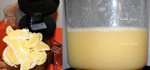 Следующими были апельсины. Однако в команде традиционных соковыжималок замена — вместо универсальной модели в бой вступает специальный аппарат для отжима сока из цитрусовых. Обычно с его помощью я получаю полный стакан сока (около 200 мл) из 1,5-2 апельсинов. Так что беру 2 апельсина, режу пополам и приступаю к отжиму — всё как всегда, 2 плодов хватает для наполнения стакана. Сока получается чуть более 200 мл.