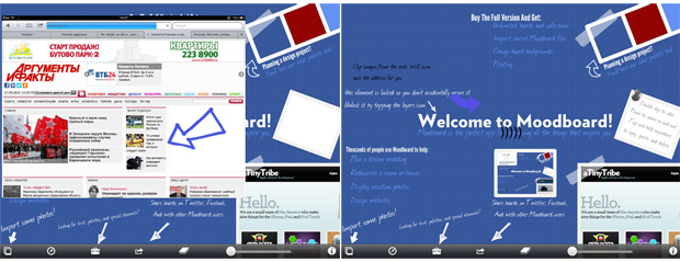 Картинки для работы можно брать из памяти устройства или из встроенного браузера. Каждую доску можно отправить друзьям в социальные сети или пользователям Moodboard. Есть бесплатная версия программы, в платной версии неограниченное количество досок, можно изменять их фон и печатать результат.