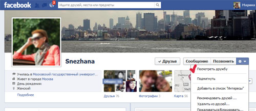 Страничку о дружбе придумал один из сотрудников Facebook и представил ее на хакатоне (мероприятии, где сотрудники социальной сети придумывают что-то новое). Чтобы найти эту страничку, нужно сначала зайти в профиль вашего друга. Затем найти значок настроек в верхней панели (справа от функций «Сообщение», «Позвонить»). Вам нужна строчка «Посмотреть дружбу».