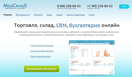 Еще одно облачное решение для бизнеса – сервис «МойСклад», который позволяет интернет-магазинам, представителям розничной и оптовой торговли обрабатывать заказы, регистрировать розничные продажи, работать с клиентской базой, вести складской учет, контролировать финансы, печатать документы. Также с его помощью можно управлять сетью подразделений или торговых точек. Сервисом уже воспользовались 100 000 компаний.