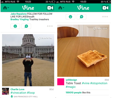 Сразу после запуска Vine очень популярными были ролики о еде и сюжеты из бумаги – вот рыбки плывут по сковородке, а вот нарисованный персонаж курит трубку… Сейчас сюжеты стали сложнее и интереснее.