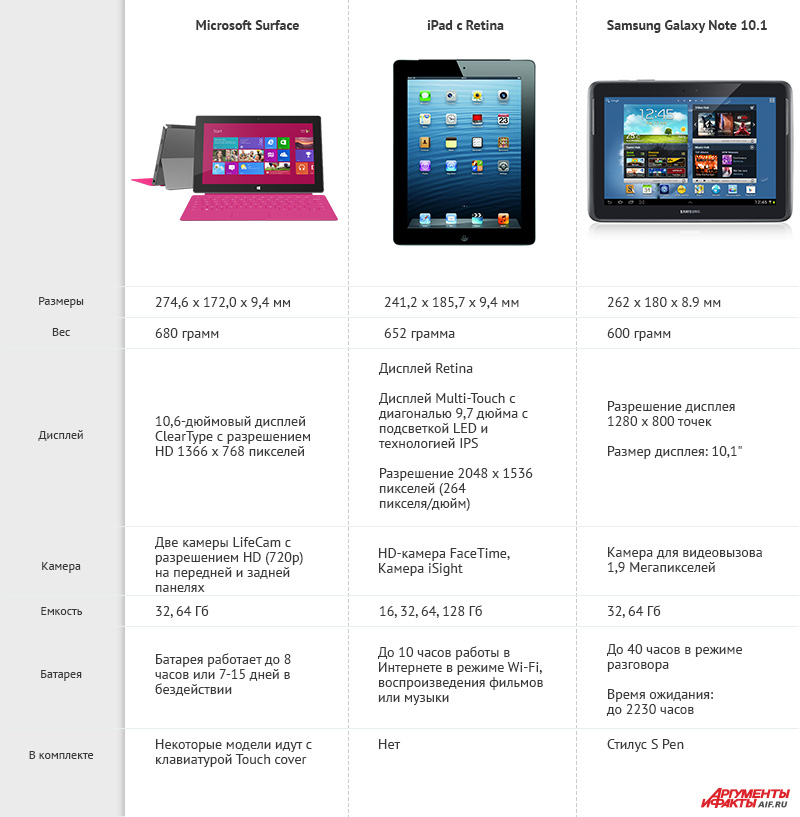 Surface длиннее своих конкурентов — 274,6 мм (iPad из них самый компактный) и самый тяжелый — 680 грамм. Для тех, кто с планшета читает, Surface будет сильно проигрывать iPad Mini и другим устройствам похожего формата. Mini не такой маленький, как iPhone, чтобы читать без вреда для зрения, и не такой большой, как, предположим, полноразмерный планшет от Apple.