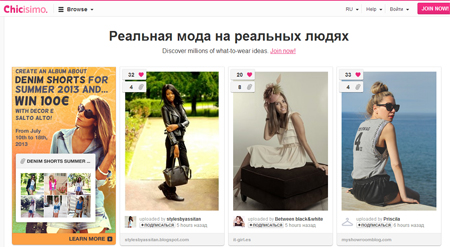 Схожий проект Chicisimo.com делает ставку на вдохновение и позитив, образы здесь можно забирать в свою коллекцию, а понравившиеся вещи - покупать. Об этом сервисе писали и The wall street journal, и Vogue, российские пользователи здесь тоже есть. Работает тематический поиск, можно смотреть только платья или только сумки, или только вещи одного бренда.
