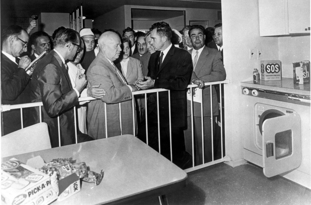 Никита Хрущёв и Ричард Никсон на «кухонных дебатах», посвящённых быту граждан, 1959 г.