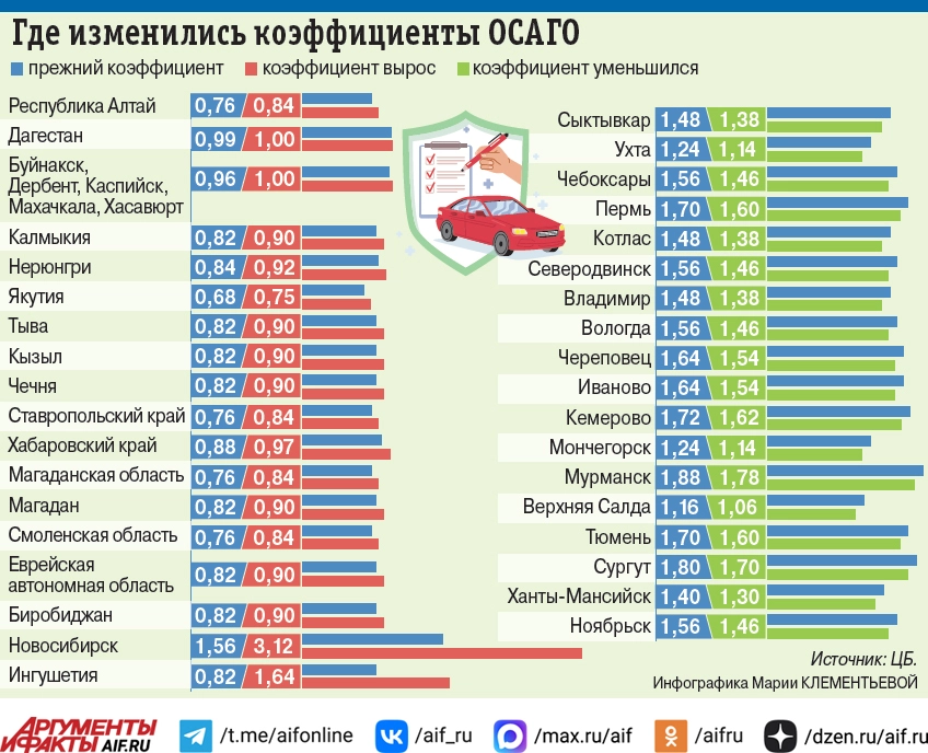 Во-первых, для начала объясню про территориальные коэффициенты (КТ). С декабря они снижаются для 20 территорий и повышаются для 28. По закону стоимость полиса ОСАГО рассчитывается по сложной формуле, где базовая ставка умножается на несколько коэффициентов. Один из важнейших как раз КТ, и он учитывает, насколько высока вероятность попадания в ДТП в этой местности, а также некоторые другие факторы, например, уровень страхового мошенничества. И самая сложная ситуация в этом смысле сегодня (с точки зрения Российского союза автостраховщиков, РСА) — в двух российских регионах: Новосибирской области и в Республике Ингушетия. Там не только шансы попасть в ДТП выше, но и куда тяжелее ситуация со страховым мошенничеством. Поэтому в ряде районов этих регионов (не во всех!) коэффициент повышают вдвое. То есть цена полиса вырастет ровно в два раза...