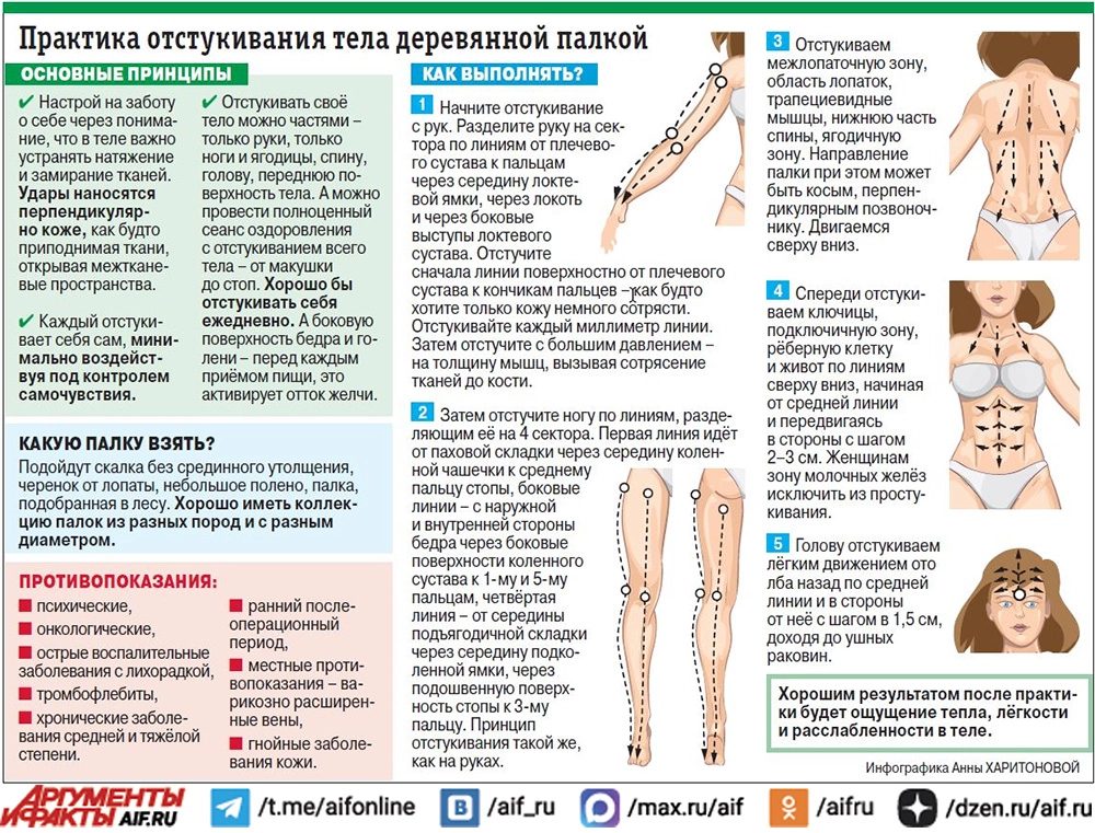- Отстукивать свое тело можно частями — только руки, только ноги и ягодицы, спину, голову, переднюю поверхность тела. А можно провести полноценный сеанс оздоровления с отстукиванием всего тела от макушки до стоп. Хорошо бы отстукивать себя ежедневно. А боковую поверхность бедра и голени — перед каждым приемом пищи, это активирует отток желчи.