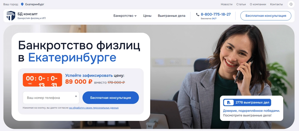 Компания «БД Консалт» оказывает правовую помощь в рамках процедуры банкротства по всей России. Есть офис в Екатеринбурге, также процедуру можно пройти полностью онлайн.