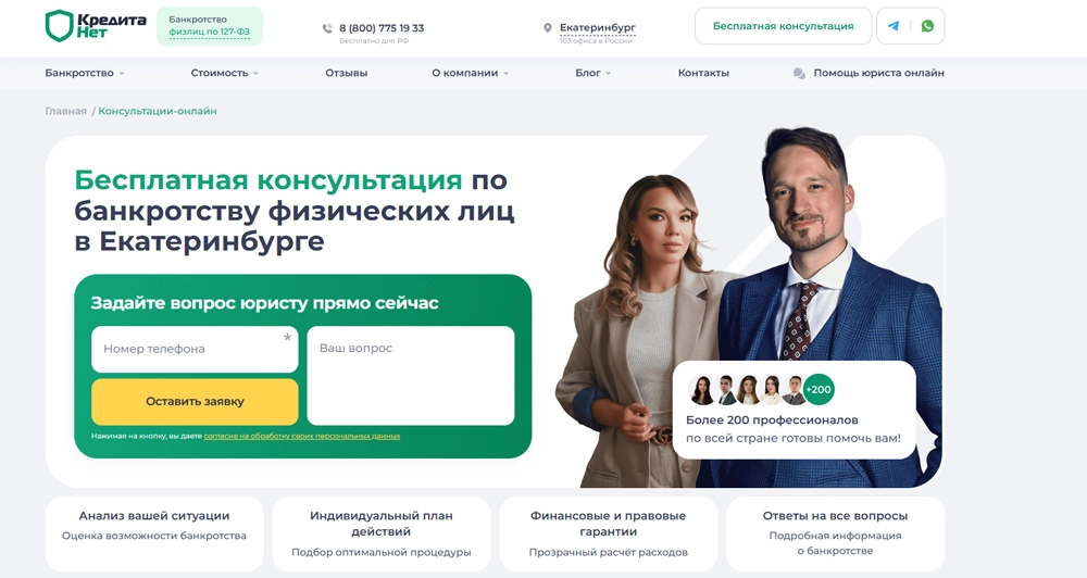 «КредитаНет» занимает лидирующие позиции в рейтингах компаний по банкротству физических лиц в Екатеринбурге. Фирму высоко оценивают многие независимые ресурсы, например РБК. Организация работает по всей стране, включая Екатеринбург. Если вы не хотите приезжать в офис и участвовать в судебных заседаниях, всю процедуру можно пройти полностью дистанционно.