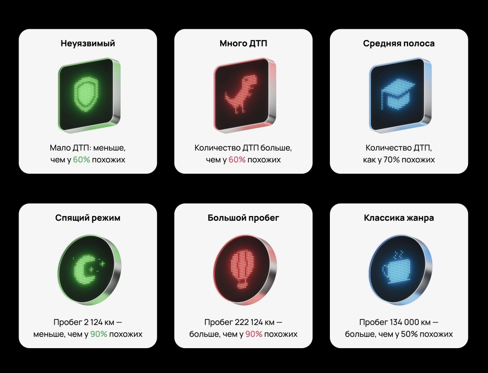 Результат анализа представлен в отчетах в виде наглядных бейджей — это визуальные маркеры, с помощью которых можно быстро оценить, больше или меньше пробег и количество зафиксированных ДТП у выбранного автомобиля относительно схожих машин на платформе.