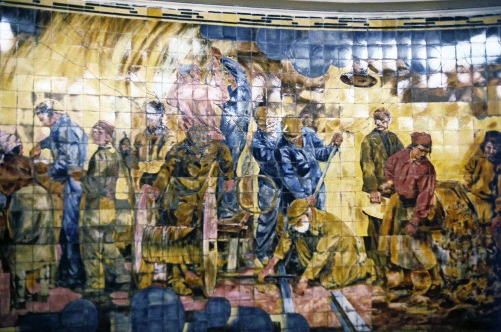 Если же перейти с Кольцевой линии на Сокольническую, то там можно будет увидеть работы Евгения Лансере, картины которого также хранятся в Третьяковской галерее. В метрополитене же представлены два его масштабных майоликовых панно — «В мастерской МТС» и, внимание, «Проходка шахты метро». Евгений Евгеньевич, работая над эскизами, несколько раз спускался в шахту метростроевцев, так что Сталинская премия за эту работы им заслужена честно.