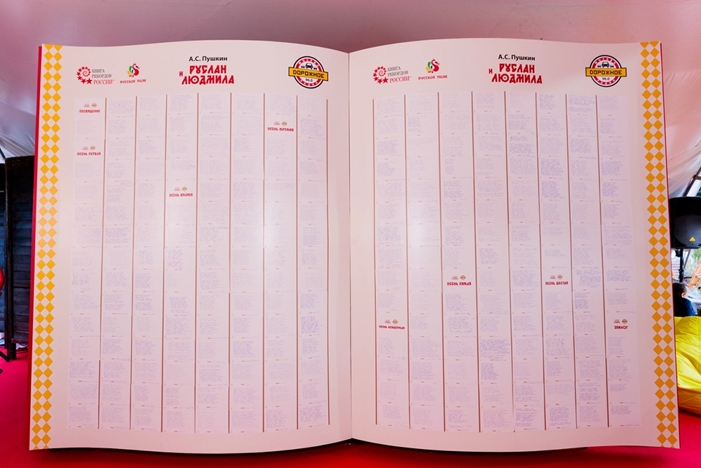 232 гостя фестиваля из Москвы, Калуги, Брянска, Нижнекамска, Рославля и других городов стали соавторами грандиозного рекорда по воссозданию полного текста поэмы Александра Пушкина «Руслан и Людмила». Бессмертное произведение великого классика было запечатлено в шатре «Дорожного радио» на уникальном арт-объекте — гигантской книге размером со сказочную избушку на курьих ножках. Внесли свой вклад и всенародно любимые артисты, друзья «Дорожного радио» — Сергей Войтенко, Денис Клявер и Дмитрий Колдун.