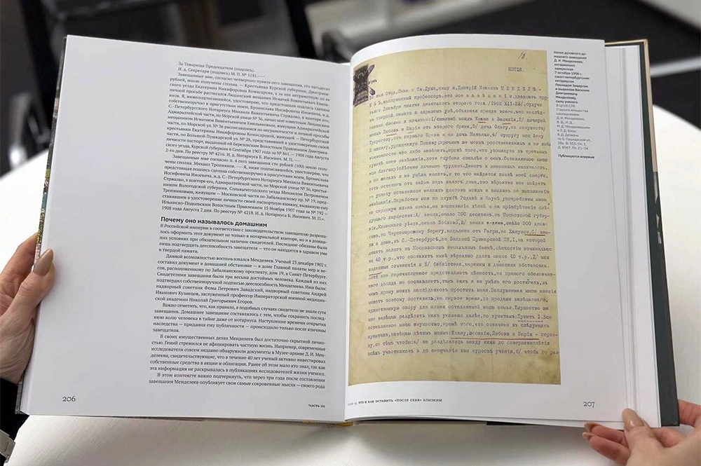 Ряд документов публикуются впервые. Например, как отметил Таранков В., «читателям книги предоставлена редчайшая возможность впервые за 120 лет увидеть и прочитать полный текст нотариально заверенной копии последнего домашнего духовного завещания Д. И. Менделеева (1902), ранее не известного для исследователей. В нем, наряду с правовыми вопросами, отражены духовно-нравственный основы финансовой культуры ученого.»