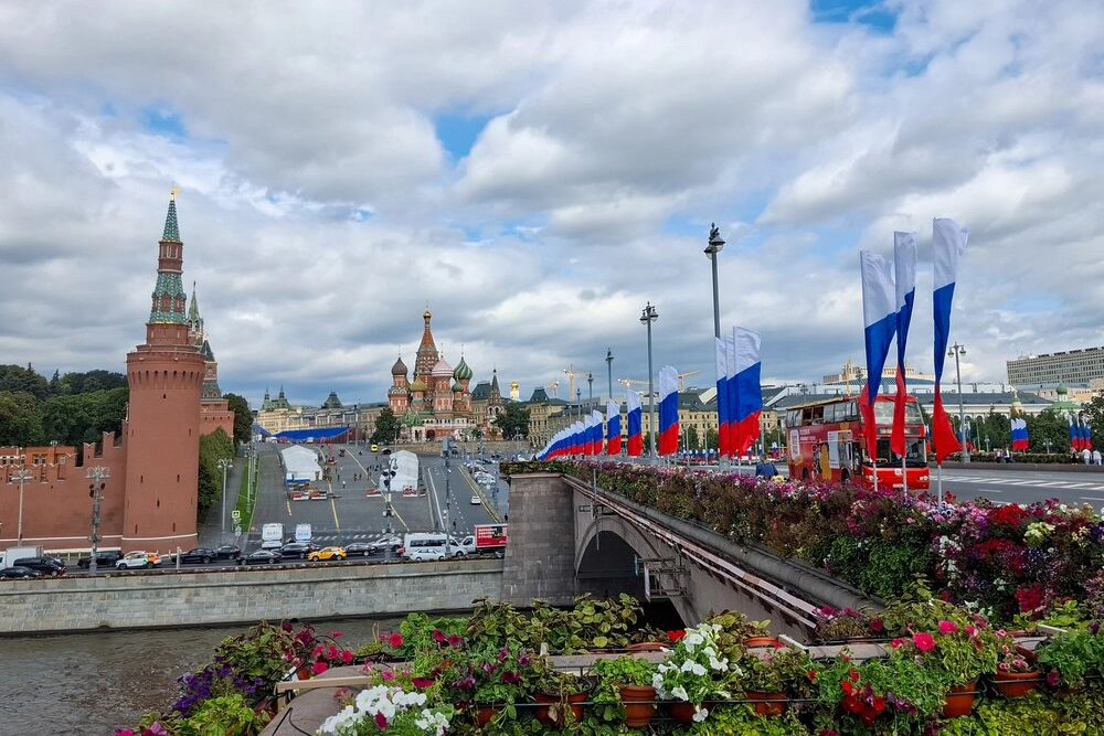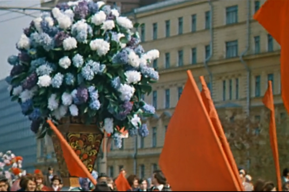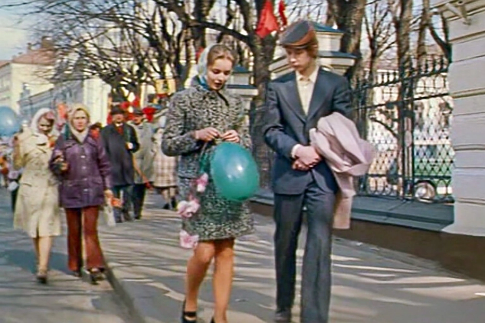 Немногие уличные локации «Розыгрыша» связаны не только с МИИТ, но и с первомайской демонстрацией, во время которой школьники и все остальные участники этого мероприятия проходили по Красной площади. А после они шли по Большому Москворецкому мосту, за которым видны Собор Василия Блаженного и кремлевские стены.