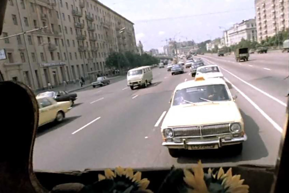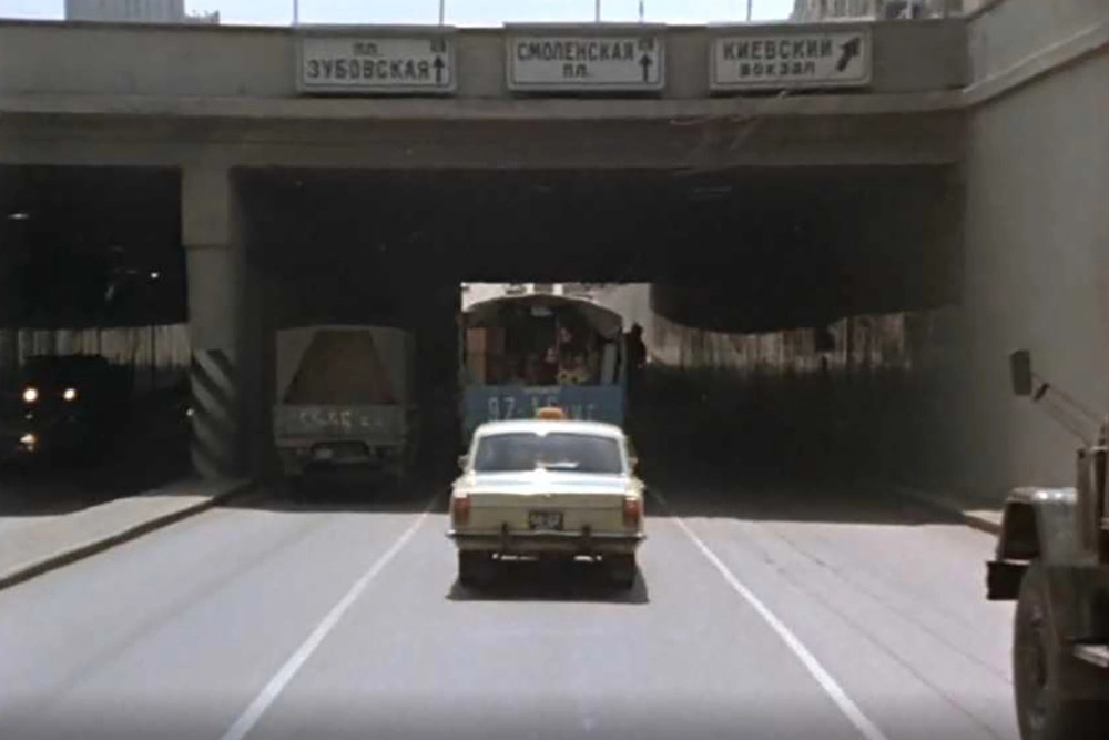 А уже в следующий момент караван въезжает в автомобильный тоннель под Калининским проспектом (сейчас это улица Новый Арбат) — и движутся они в сторону Зубовского бульвара, то есть по направлению к тому самому Крымскому мосту. Впрочем, благодаря монтажу в кино возможны и не такие чудеса.