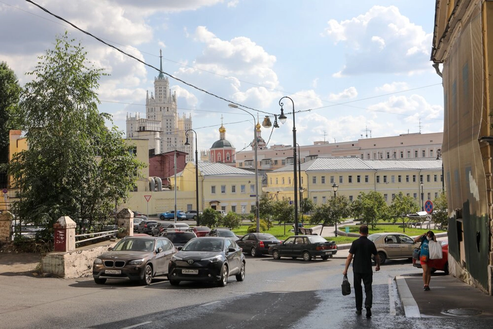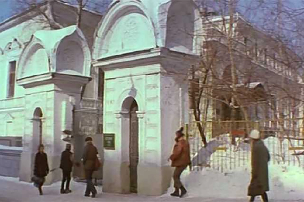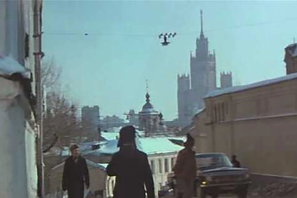 Многие живописные кадры в «Усатом няне» сняты в районе так называемой Ивановской горки — она считается одним из семи холмов Москвы, находится восточнее Кремля, неподалеку от Покровского бульвара и рядом с Хитровкой. Этот кадр из фильма снят на перекрестке Хохловского и Малого Ивановского переулков, а вдалеке видна высотка на Котельнической набережной. Кстати, в этом районе снимали многие фильмы — например, «Петровку, 38» или «Брат 2», а в картине «Тегеран-43» перекресток Солянки и улицы Забелина с успехом заменил небольшой кусочек Парижа.