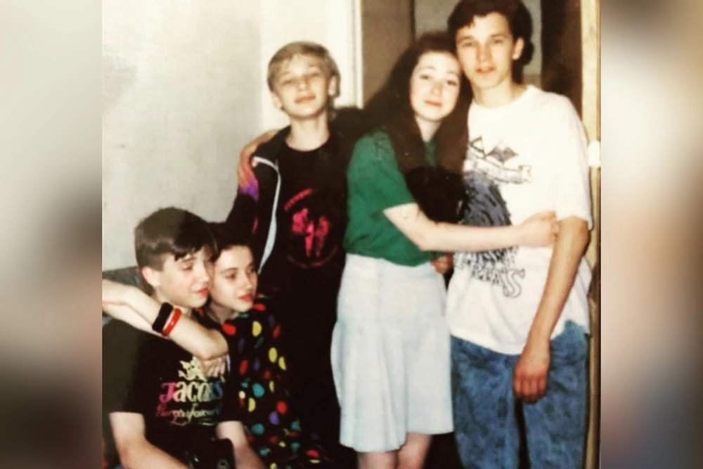 Молодая, сияющая Анна с однокурсниками запечатлена в беззаботные студенческие годы. Их лица излучают радость, все они тепло обнимаются, улыбаясь в объектив. Видно, что это момент настоящей, искренней дружбы и общих творческих мечтаний. Названные имена — Паша Трубинер, Костя Ивин, Юля Лисеева, Миша Калиничев — теперь известные в театральном мире люди. Эта архивная фотография — трогательная машина времени, полная ностальгии по юности.