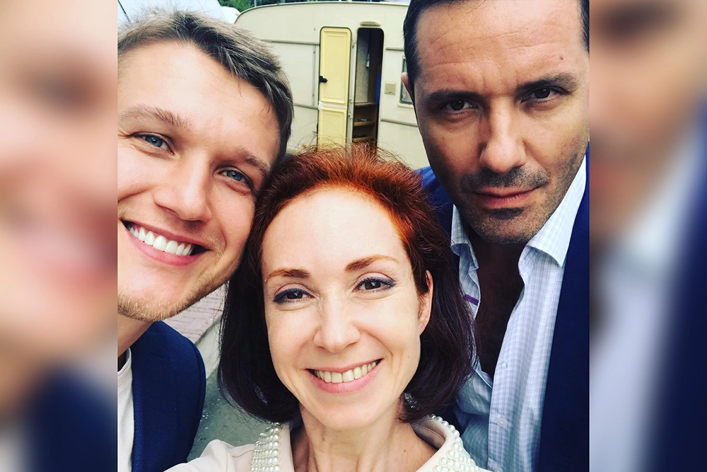 Анатолий Руденко, Анна Большова и Александр Никитин на съёмках сериала «Свадебные хлопоты» в 2021 году. Яркая рабочая атмосфера съёмочной площадки. Коллеги — Руденко, Большова и Никитин — позируют в костюмах своих героев. Они улыбаются и явно находятся в хорошем настроении. Кадр динамичный и живой, полный энергии совместного творчества. По их расслабленным позам понятно, что работа над проектом приносит им удовольствие.