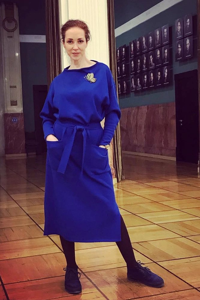 В театре актриса позирует в синем платье. Лёгкая грусть в глазах. Акцент снова на лице — выразительном и живом. Свет падает так, чтобы игрой света и тени подчеркнуть её черты. Этот снимок рассказывает о многогранности её натуры, способности быть разной.