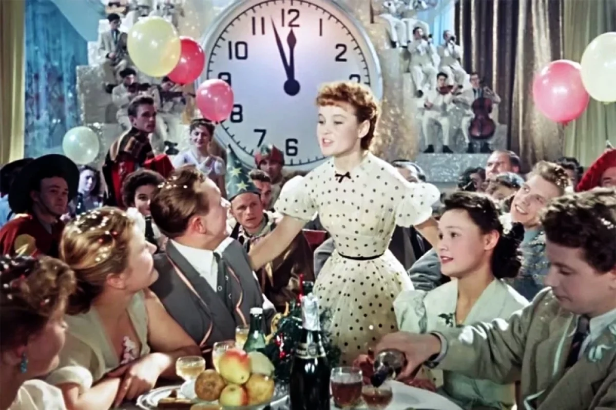 Дебютный художественный фильм Эльдара Рязанова и дебют в кино для молодой актрисы Людмилы Гурченко, после которого она стала настоящей звездой отечественного кино. Напомним сюжет: в городском Доме культуры идет подготовка к новогоднему балу-маскараду, программа которого выдержала испытание временем — это концертные номера, танцы, выступления фокусников и непременные карнавальные костюмы. Но новый директор Дома товарищ Огурцов (неподражаемый Игорь Ильинский) решает внести в эту программу собственные изменения и добавить немного привычной бюрократии («Товарищи, есть установка весело встретить Новый год»). В общем, происходит стандартная для кино тех лет борьба плохого и хорошего, веселого и скучного, в которой молодость с разгромным счетом побеждает, а в финале Гурченко поет запоминающуюся песенку про «Пять минут». Подобные балы продолжались долго, несколько десятилетий; в наше время они превратились в «корпоративы», которые, правда, часто проводятся за несколько недель до собственно новогодней ночи.