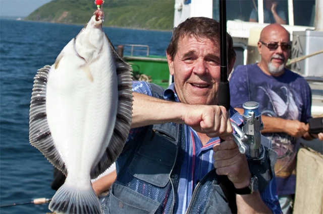 Народный артист России Алексей Булдаков на рыбалке в акватории залива Анива в рамках неофициальной части кинофестиваля «Сахалинский экран». На дальнем плане — телерадиоведущий Давид Шнейдеров, 2011 год. Фото: РИА Новости/ Владимир Михайлов