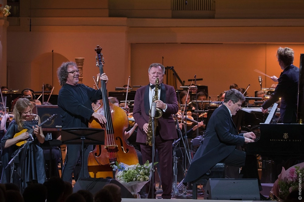 Вторую часть концерта — в стиле симфо-джаз — Денис Мацуев провел с Иваном Никифорчиным, самым молодым руководителем симфонического оркестра (МГАСО), недавно получившим премию Президента России. На сцену также вышли Игорь Бутман с саксофоном, Екатерина Мочалова с домрой, Андрей Иванов с контрабасом и Борислав Струлев с виолончелью.