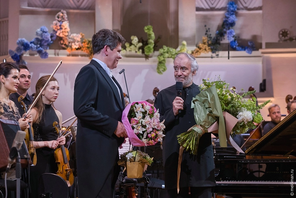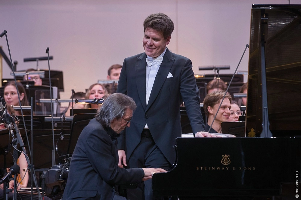 Первым вышел к национальному молодежному симфоническому оркестру Валерий Гергиев, чтобы потом успеть на концерт в «Зарядье» с оркестром Мариинского театра. Дальше за пульт сел Юрий Башмет (а потом даже поиграл на рояле, в том числе, в четыре руки с Денисом). Оба маэстро делились со слушателями воспоминаниями о работе и дружбе с Денисом. Затем подошла очередь троюродного брата именинника Дмитрия Юровского.